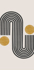 A modern minimalist abstract design featuring bold black curved lines forming arches, paired with golden circular shapes on a plain background. This geometric artwork blends retro mid-century aesthetics with contemporary style, making it a perfect statement piece for modern interiors.