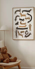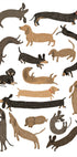 A charming and whimsical illustration of dachshunds in various playful poses, stretching, running, and relaxing. The warm earthy tones and hand-drawn style make this artwork perfect for dog lovers, children’s rooms, or anyone who enjoys fun and friendly wall art.