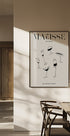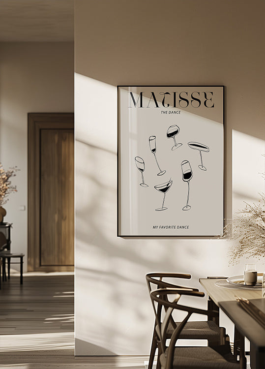 Two elegant wine glasses tilt and sway in a playful duet, captured in bold black lines on a crisp white field. Minimalist curves suggest clinking, laughter, and late-night rhythm, with a subtle nod to Matisse’s fluid grace. A chic, contemporary accent for kitchens, dining rooms, and spirited spaces.