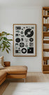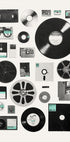 A nostalgic composition of vintage media and data storage formats including vinyl records, cassettes, floppy disks, CDs, and film reels. This artwork celebrates the evolution of technology and music, bringing a retro charm to modern interiors.