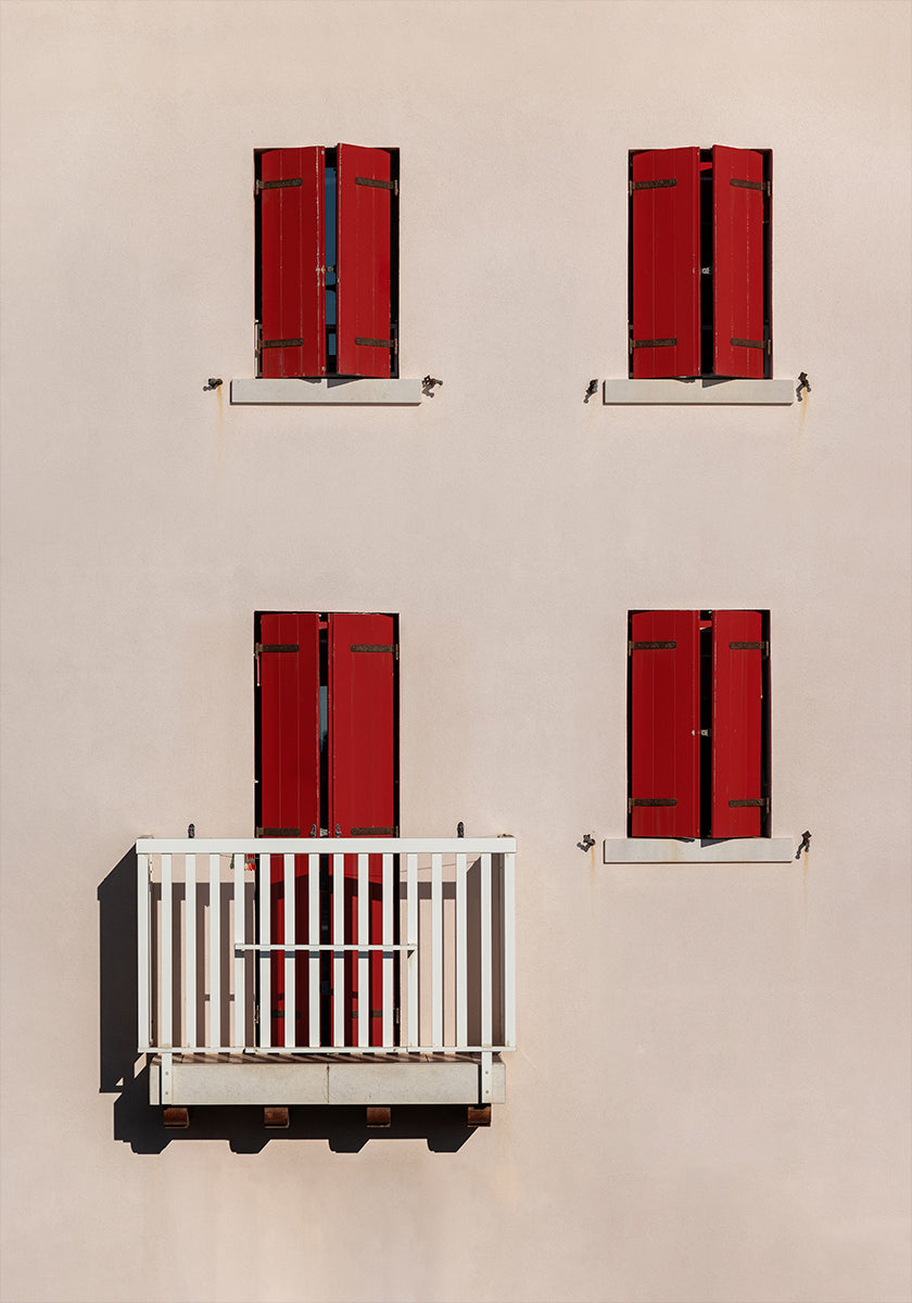 Sunlit facades in an Italian seaside town cast bold, distinct shadows—balconies, shutters and windows carving graphic geometry across a vivid red wall. This striking urban scene, photographed by Andrea Comari, evokes Caorle’s Venetian charm and the crisp rhythm of holiday light. A tribute to color, architecture, and the poetry of streets.