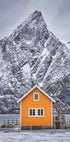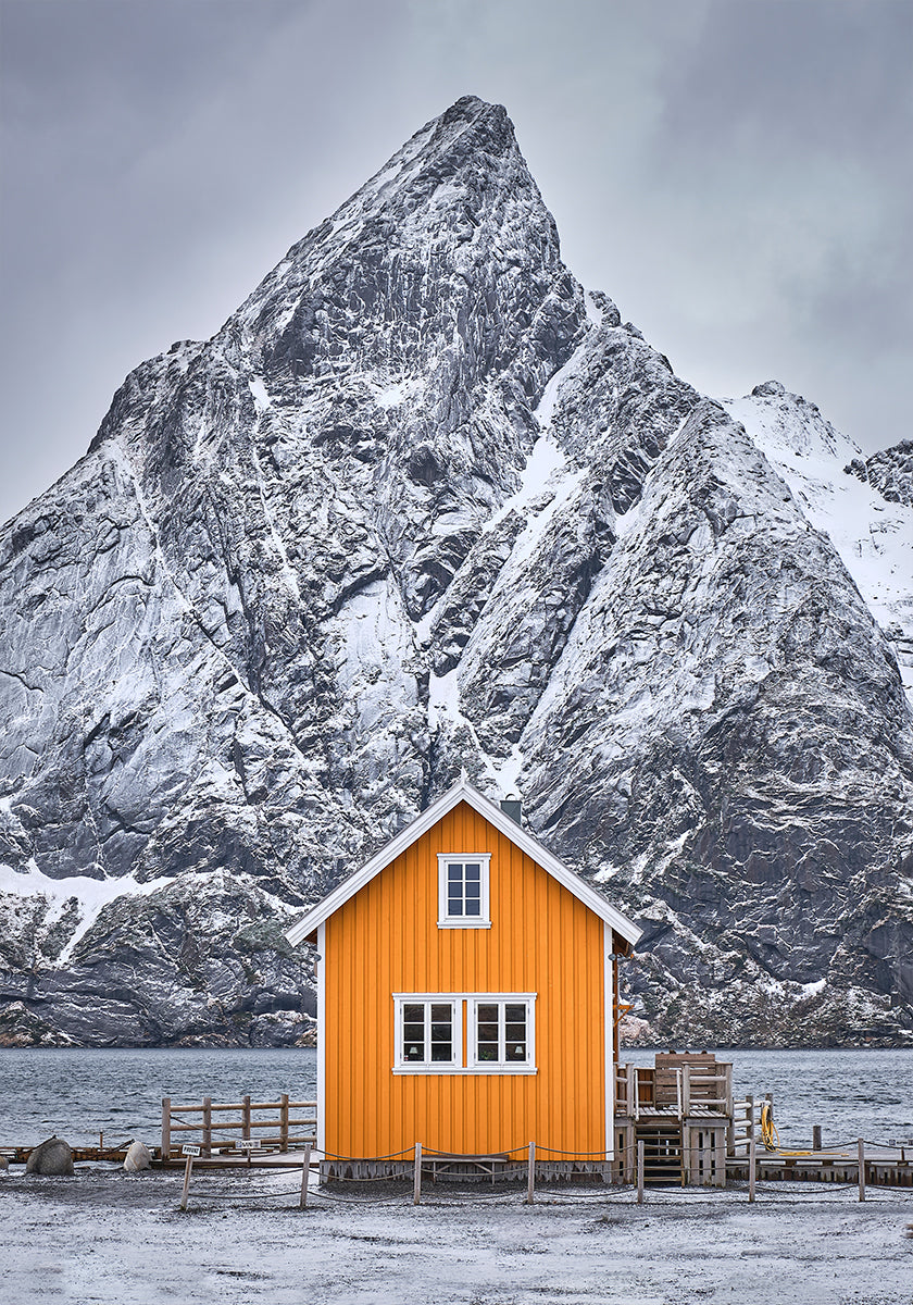 Snow-dusted peaks loom over a lonely yellow cabin on a Nordic coastline, where steel-blue water meets a brooding winter sky. This dramatic landscape by photographer Hamed Bank captures crisp air, silent frost, and the calm resilience of life at the edge—an evocative scene of solitude, light, and rugged beauty.