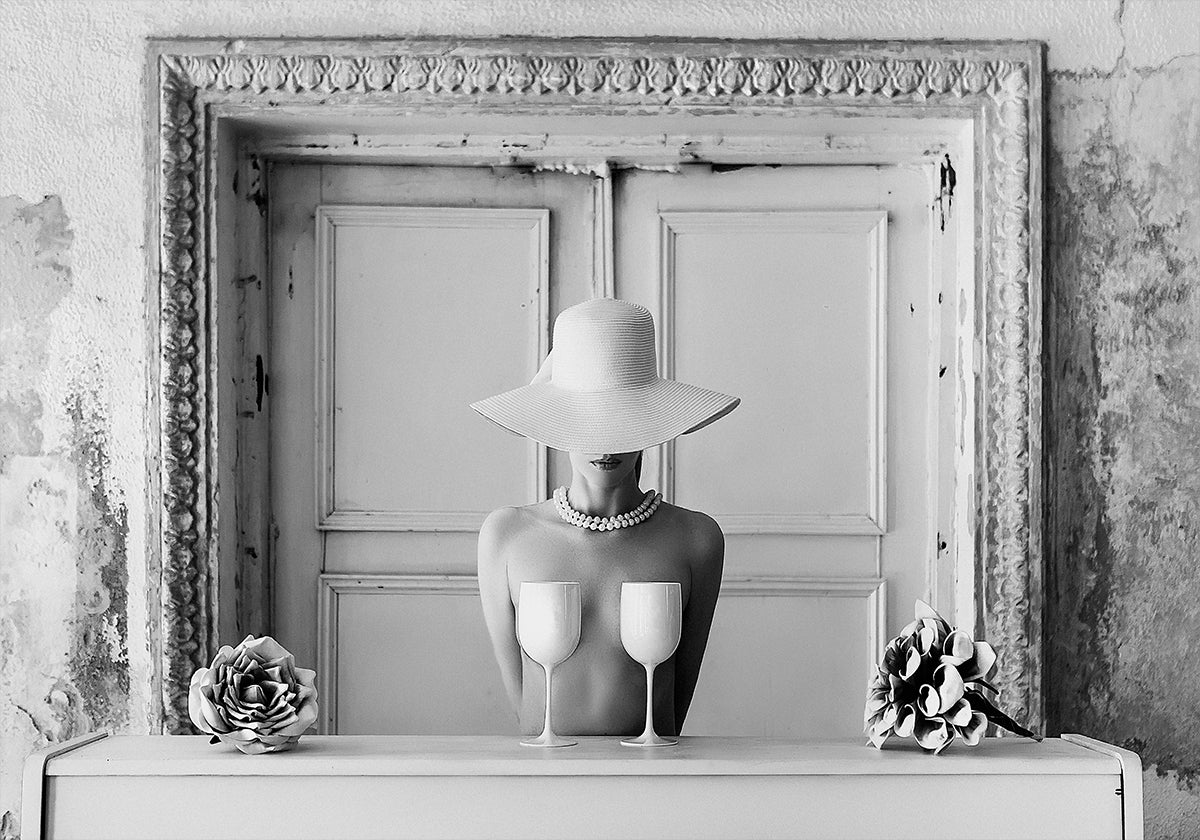 Duality by Ruslan Bolgov captures a chic black-and-white moment: a poised woman in a wide-brim hat and pearls, framed by a doorway, suspended between light and shadow. Champagne glasses and refined bar details echo her elegance, while the mirrored composition teases identity and timeless style. A striking statement for modern interiors.