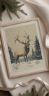 Bring winter wonder home with this elegant elk scene: towering antlers crowned in frost, standing calm amid whispering pines as snow drifts through a pale sky. Cool beige tones and crisp contrasts evoke Nordic quiet, making a serene centerpiece for Christmas, cabin corners, or modern, nature-first spaces.
