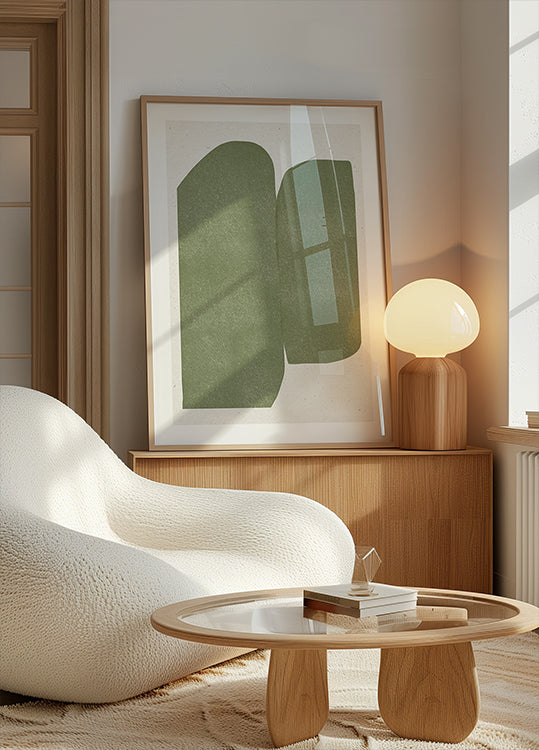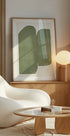 A serene study in green, Emerald Echoes layers deep emerald, moss, and jade tones into clean geometric forms. Curved arcs meet crisp rectangles in a Bauhaus-meets-Art Deco rhythm, creating a modern, minimalist statement that feels both retro and fresh—calm, composed, and quietly luxurious on any wall.