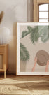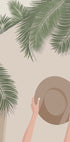 This sun-drenched illustration captures a serene summer mood with lush green palm fronds swaying above and a soft beige background setting the tone. Two delicate hands gently hold a wide-brimmed straw hat, evoking the simple pleasures of a warm, relaxing day under tropical shade. A perfect reminder to slow down and enjoy the present moment, this piece brings breezy, vacation-inspired calm to any gallery wall or living space.