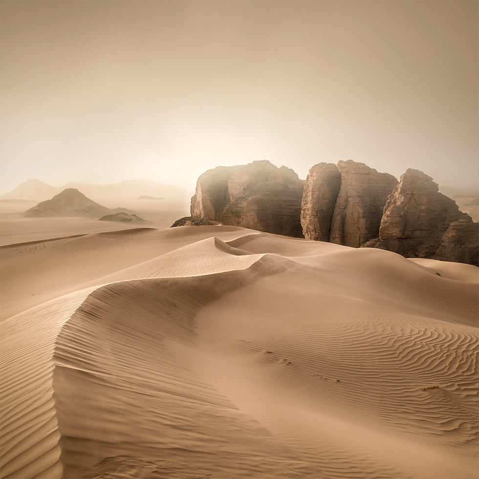Jean-Luc BILLET captures the vast serenity of Erg Admer in Algeria: rippling dunes in soft beige sweep toward towering sandstone cliffs, etched by wind and time. A delicate heat haze blurs the horizon, while subtle shadows trace the curves of sand, evoking solitude, scale, and timeless desert calm. Grandeur.