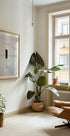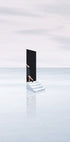 A surreal conceptual artwork depicting a person stepping through a dark doorway suspended above calm reflective waters. The minimalist setting, with a staircase leading into the void, evokes themes of escape, departure, and new beginnings. The scene blends dreamlike surrealism with mid-century inspired aesthetics.