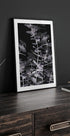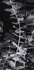 An artful negative of eucalyptus takes center stage: lilac-tinted leaves and inky stems float on velvet black, layered in gentle double exposure. A moody, graphic botanical—part still life, part abstraction—suggesting midnight bloom and soft motion; striking yet serene for minimalist, modern interiors.