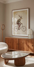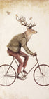 By artist Mike Koubou, this whimsical, vintage-style print portrays a dapper stag in a tailored coat pedaling a classic bicycle, antlers poised like a crown. Sepia hues, fluttering birds, and forest quietude lend a surreal, storybook charm—perfect for eclectic walls and modern rustic moods. A playful ode to travel and wild elegance.