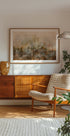 Evening City by Christina Sillen drifts into view as a tranquil, atmospheric skyline. Soft, expressionist blocks of skyscrapers rise through sepia and ochre haze, brushed with muted greens and smoky greys. Golden dusk light pools across the urban landscape, revealing textured depth and modern calm. A serene ode to the contemporary metropolis.