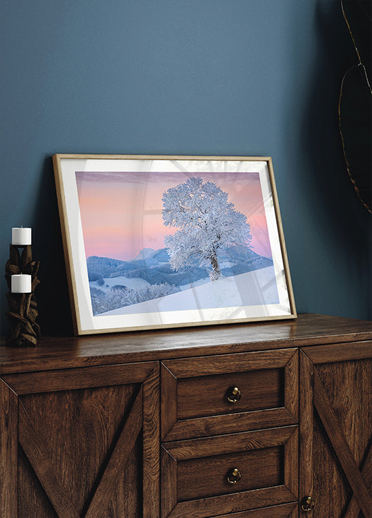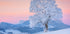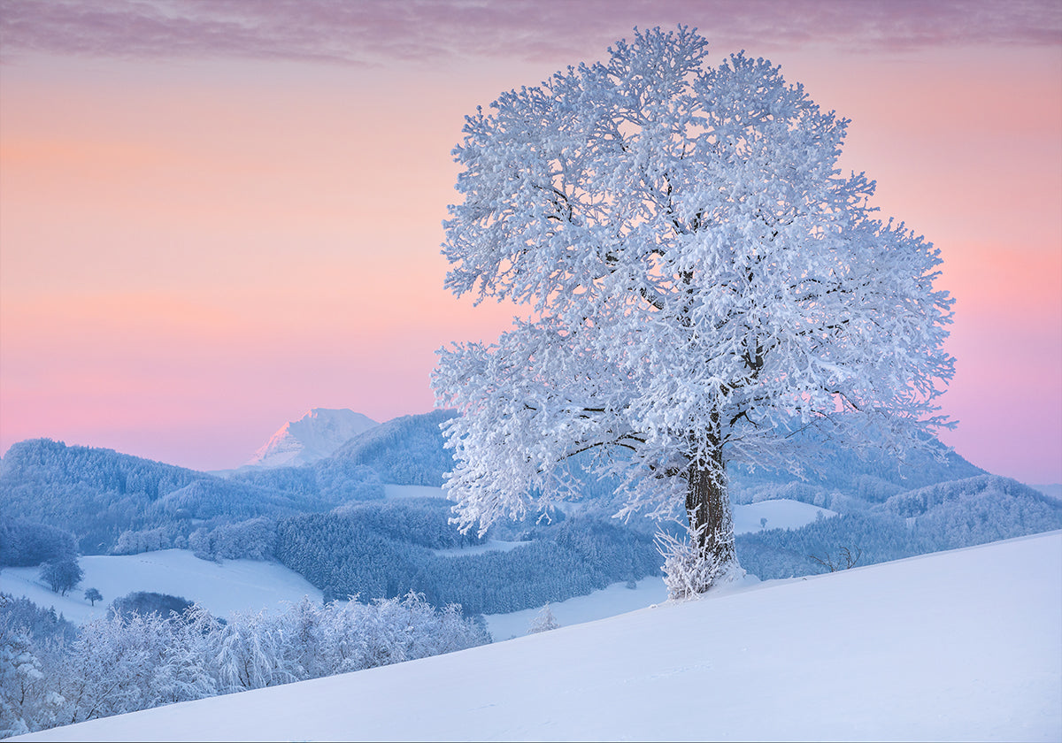 At dawn, a solitary tree crowns a snow-dusted slope, its branches rimmed with hoarfrost beneath pastel skies. Mountains soften in the distance as rose and misty blues glow across the winter air. exposed by Burger Jochen captures the hush of early morning, a serene study of light, cold, and quiet resilience.