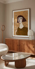 An expressive, modern portrait by Sharyn Bursic: a poised woman with a sleek bob and luminous green eyes, rendered in painterly strokes and earthy, green-washed tones. The face is both bold and tender, balancing abstraction with figurative detail, inviting intimate contemplation and contemporary edge. A striking focal point for modern spaces.