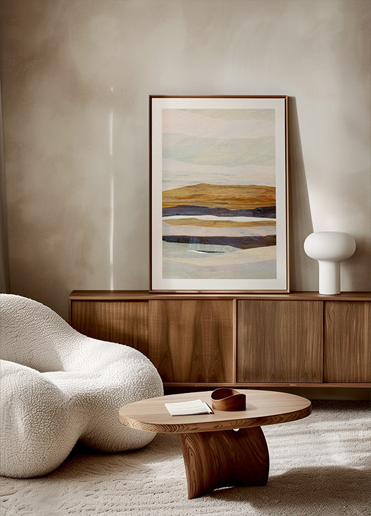 Fallow 3 by artist Dan Hobday drifts between landscape and abstraction. Airy brushstrokes sweep across a neutral field of sand, stone, and cloud, evoking wind over open water and distant horizon. Subtle texture and restrained movement create a calm, modern focal point for serene spaces. Perfect for minimalist interiors.