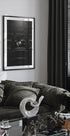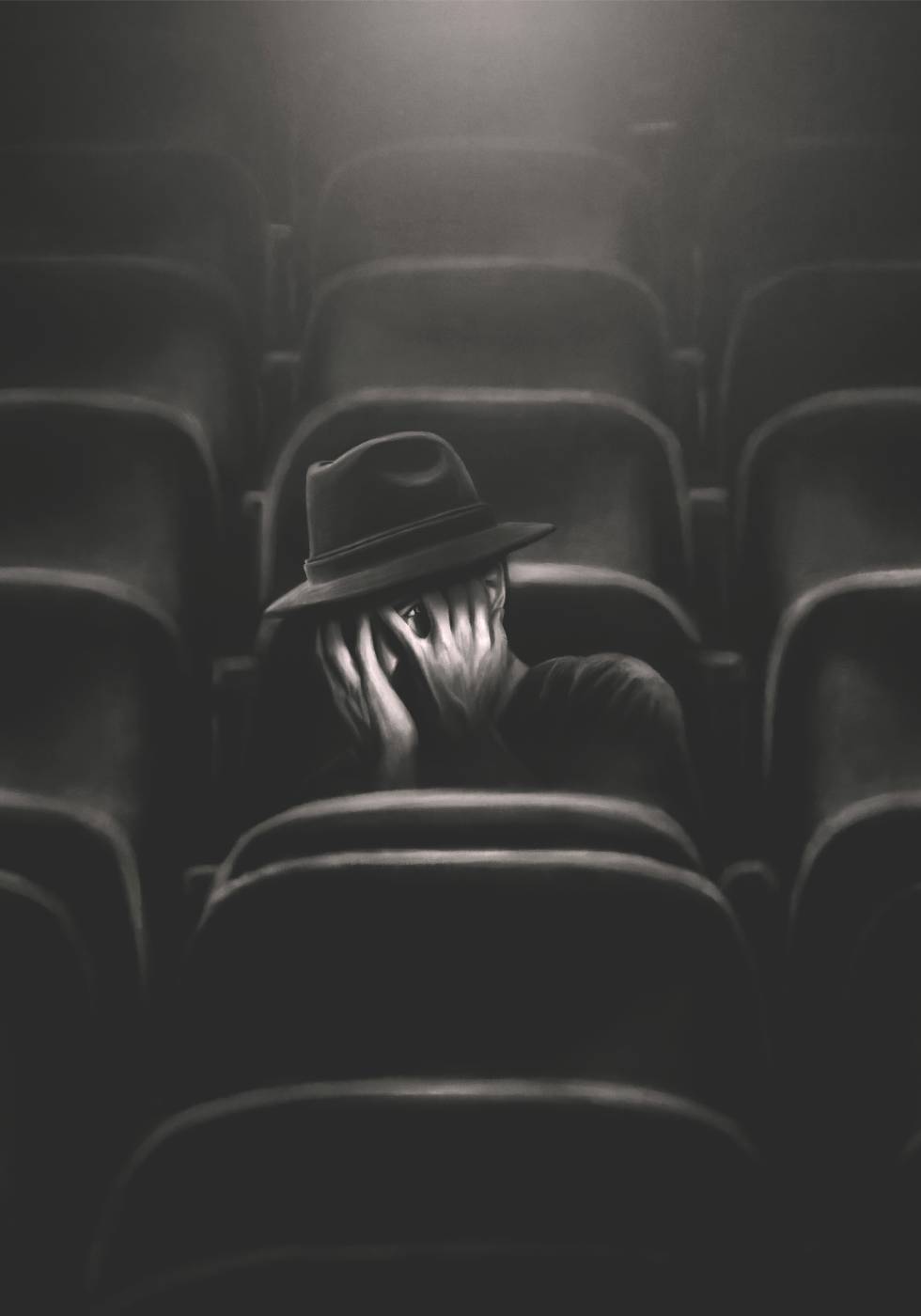 A haunting monochrome image of a man sitting alone in a dark theater, his face buried in his hands with only one fearful eye peeking through. This surreal piece explores isolation, anxiety, and the vulnerability of being watched.