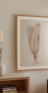 A single white feather floats in a luminous, high-key field, its soft barbs and delicate shadow creating a calm, weightless pause. Minimal yet expressive, this serene still life invites quiet focus, bringing air, light, and a whisper of nature to hallways, bedrooms, and modern workspaces. Perfect for minimalist, airy interiors.