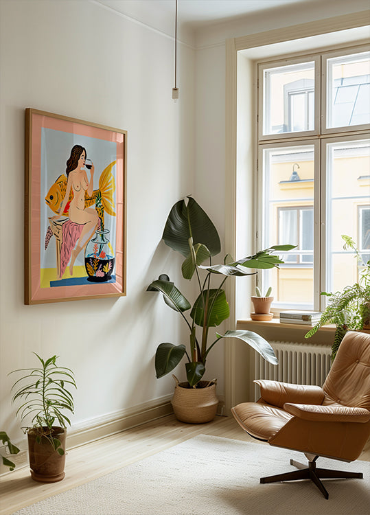 Make waves with Fishy Shananigans by artist Uma Gokhale: a whimsical, pastel-hued illustration where a mischievous fish and a carefree woman share cocktails in a dreamy bar scene. Painterly textures, soft tones, and quirky details blend seaside fantasy with weekend mischief, sparking smiles and conversation.