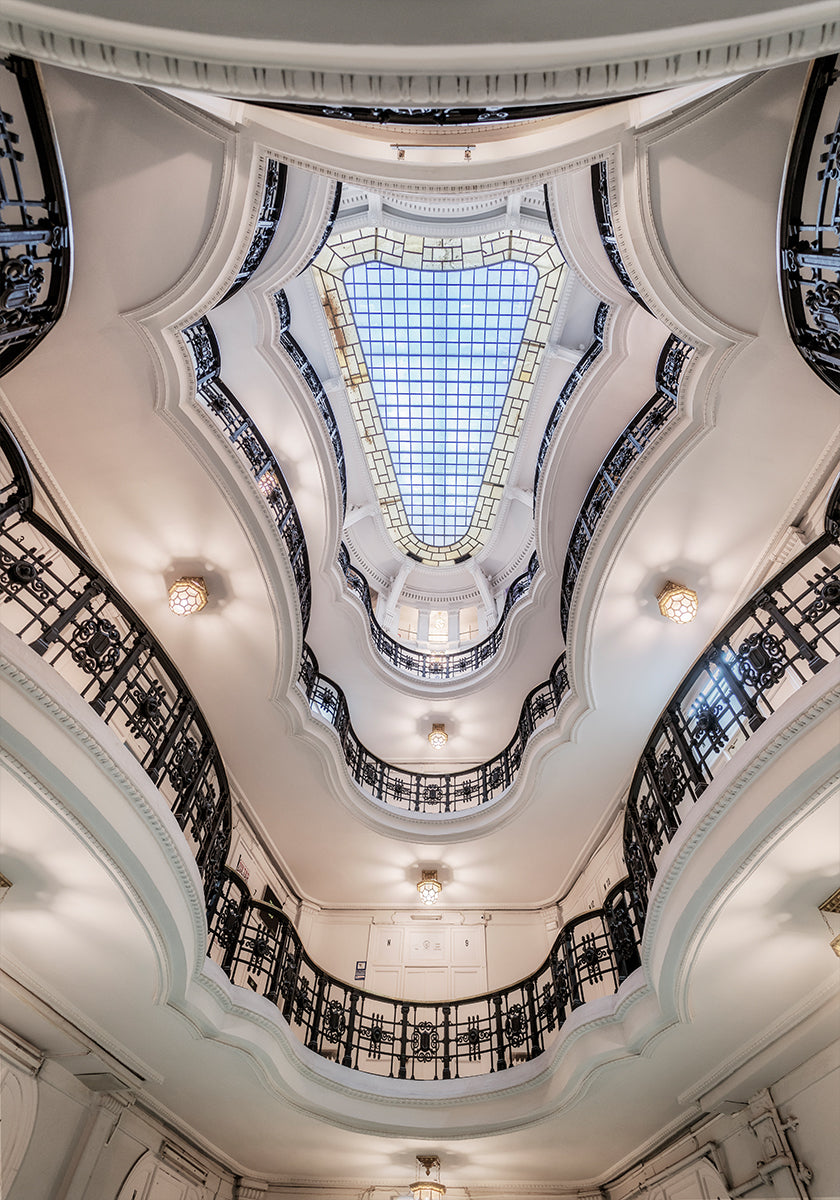 Jorge Ruiz Dueso captures the hypnotic swirl of Madrid’s Casa Palazuelo, where ascending floors and a sculptural staircase carve graphic rings of light and shadow. This urban interior study blends modernist elegance with city poise, drawing the eye upward in a mesmerizing play of geometry and perspective.