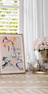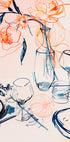 Graphic still life in cool blue and warm terracotta: a slender vase lifts airy flowers beside a martini and gleaming wine glasses on a crisp tabletop. Clean lines and painterly blocks create a calm, contemporary rhythm—perfect for kitchens, dining nooks, or a chic home bar with playful poise. An elegant accent for Scandinavian or modern interiors.
