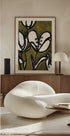Janel Bragg’s moss-green tulip study marries fluid black ink lines with velvety olive washes. Curled petals unfurl in rhythmic motion, hinting at growth, grace, and quiet drama. A modern botanical that feels both meditative and alive, it anchors spaces with depth, contrast, and serene energy. Inspired by tulips in mossy hues, it invites focus.
