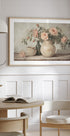 Blush-pink roses gather in a graceful ceramic vase, set on a sunlit tabletop against a warm beige ground. Soft shadows and painterly textures trace each petal and leaf, with whispering pastel greens threading the bouquet. A serene, romantic still life that lingers with vintage calm and timeless charm.