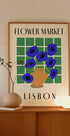 Breathe in Mediterranean charm with this retro-inspired Flower Market Lisbon Portugal poster by artist Dirkie Nell. A luminous palette of blues and greens frames wild blooms in simple vases, arranged on a neat grid with bold vintage typography—capturing summer streets, striped awnings, and market nostalgia.