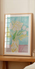 A soft pastel painting of flowers in a vase, with delicate yellow lines and green leaves set against a calming turquoise background. This painterly artwork captures a fresh and light atmosphere, perfect for adding a serene floral touch to any space.