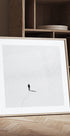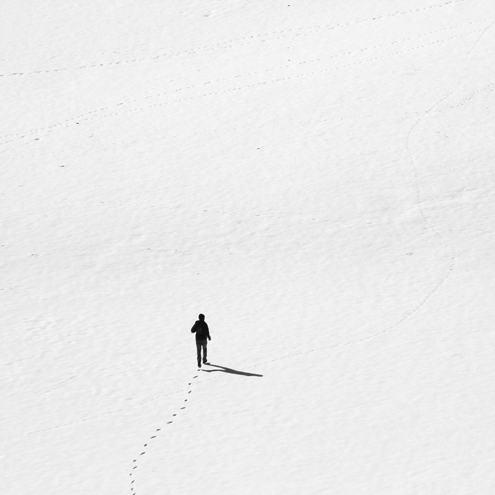 An elegant monochrome study of winter minimalism by photographer Mostafa Nodeh: from an aerial vantage, a lone figure crosses a pristine snowfield, casting a long inky shadow. Sparse footprints stitch the white expanse, sculpting quiet rhythm, contrast, and contemplation in a serene, high-key landscape.