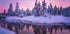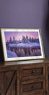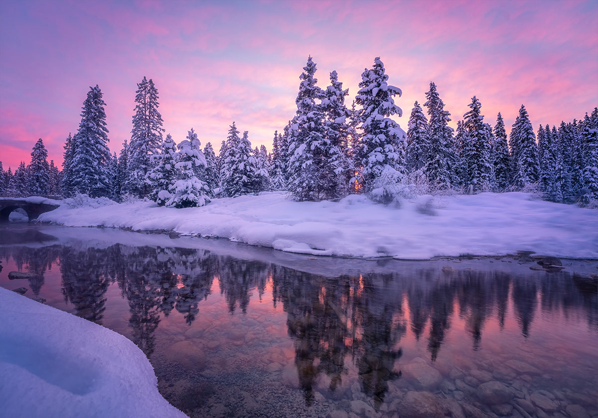 Awaken to a tranquil alpine dawn with Forest Morning by Yongnan Li (李永男). Frosted pines frame a glassy river, where snow-draped banks and silhouetted trees reflect like a mirror. Hints of rose-gold light kiss the sky above Alberta’s Lake Louise, inviting quiet breath and winter stillness. A serene ode to the Canadian Rockies.