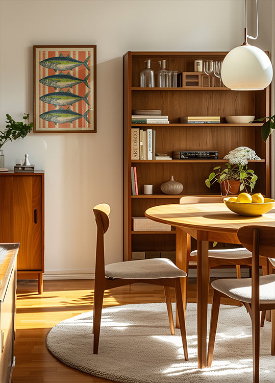 Four Fishes by Andreas Magnusson evokes classic natural-history plates: four distinct species arranged with generous white space, rendered in precise linework and softly weathered tones. Subtle texturing and scientific-plate clarity lend archival charm, perfect for coastal, kitchen, or study walls. A refined ode to marine life.