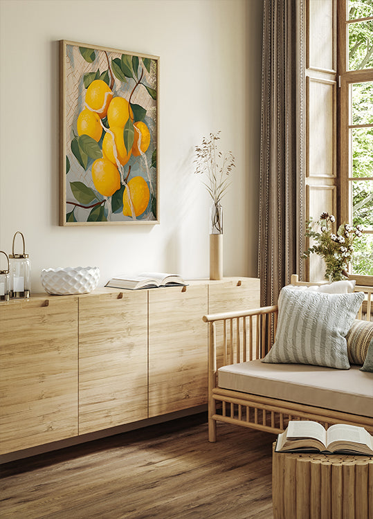 A vibrant illustration of ripe yellow lemons tangled in soft netting, with lush green leaves still attached to the branches. This citrus-themed artwork radiates freshness and Mediterranean charm—perfect for kitchens or summer decor.