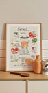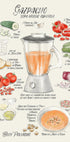 Celebrate summer with this Spanish-language illustrated recipe for gazpacho by Rosana Laiz Blursbyai. Lush tomatoes, cucumber, peppers, garlic and olive oil are drawn in bright, modern icons, paired with hand-lettered steps and measurements. A fresh, playful composition that brings Andalusian flavor to your kitchen wall.