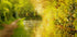 A stunning painterly landscape capturing a peaceful riverside path bathed in golden sunlight. Lush green foliage blends harmoniously with warm tones, evoking the serene beauty of a summer day. This artwork brings warmth and tranquility to any interior space.