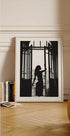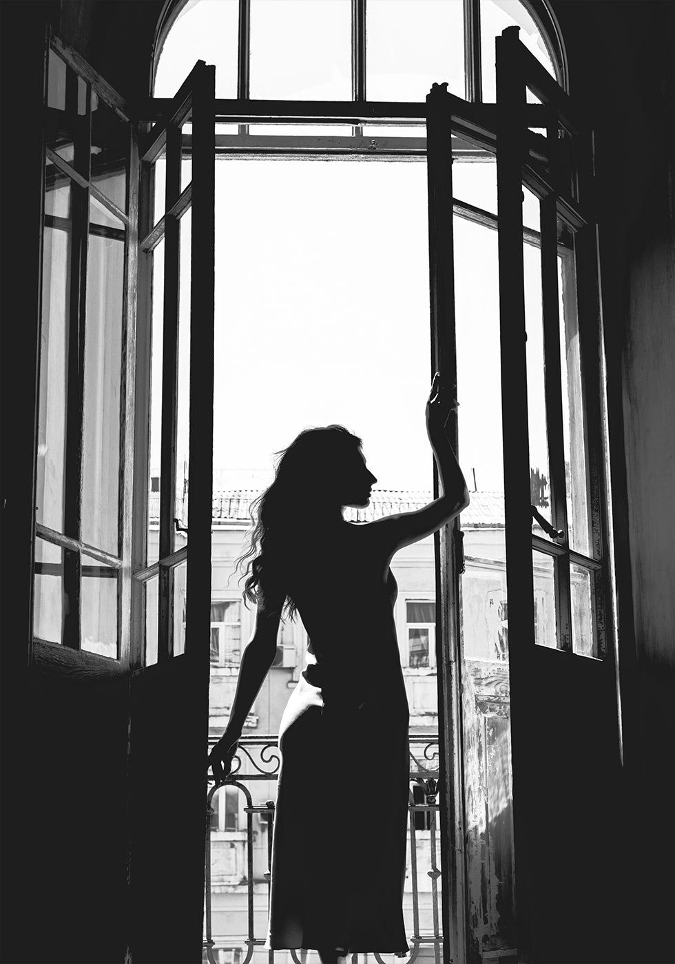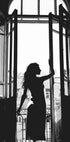A striking black and white silhouette of a woman standing by a balcony window, exuding elegance and poise. The play of light and shadow creates a timeless atmosphere, making this artwork a captivating statement piece for interiors inspired by sophistication, femininity, and modern romance.