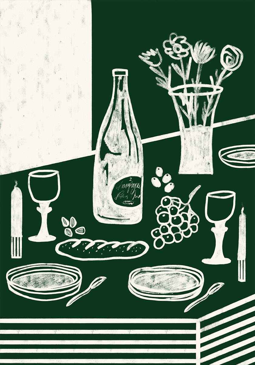 Immerse in a candlelit table scene awash in layered greens: flickering candles, flowing champagne, clustered grapes, and florals gather in rhythmic patterns and chalk-like textures. GREEN HARMONIA by Gulcihan Ozguc balances elegance and celebration, turning everyday dining into poetic ritual. Green tones unify the scene with calm refinement.