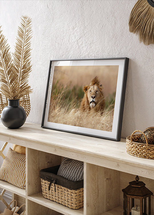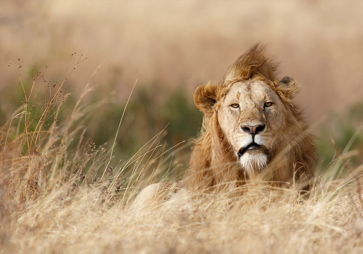 Commanding and serene, a male lion stands in wind-swept savannah grass, his mane billowing like flame as soft bokeh melts the Serengeti into gold. Every whisker and amber gaze declares the wild’s quiet authority. Captured in Tanzania by photographer Ali Khataw, this portrait crowns any space with untamed majesty.