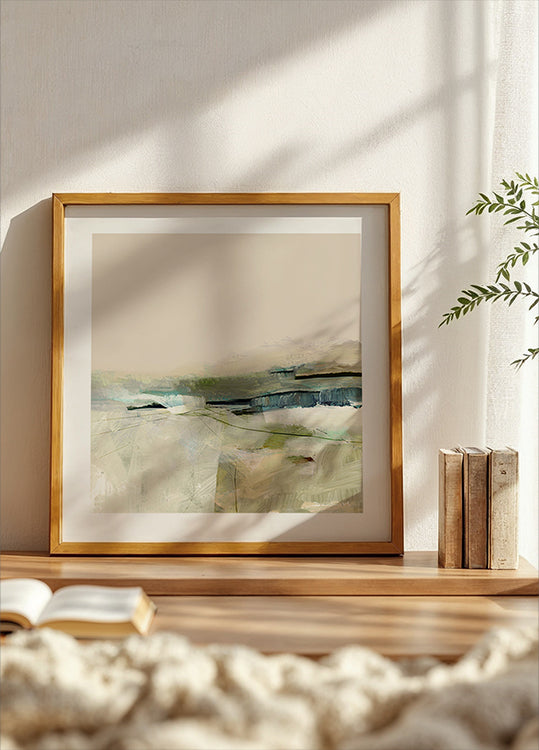 Heltor by artist Dan Hobday is a serene abstract landscape, built from broad brush strokes and soft, painterly textures. Layers of deep and muted greens drift like distant hills, meeting gentle neutrals that suggest sky and light. Minimal yet expressive, it brings calm, contemporary balance to any space.