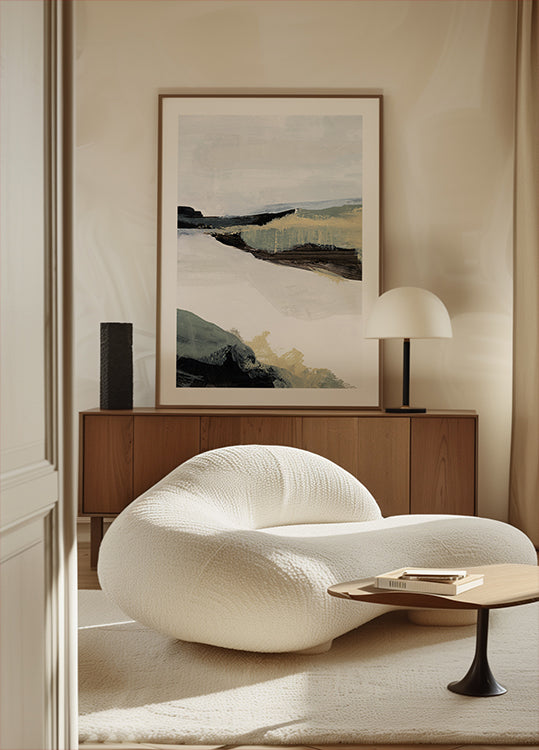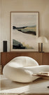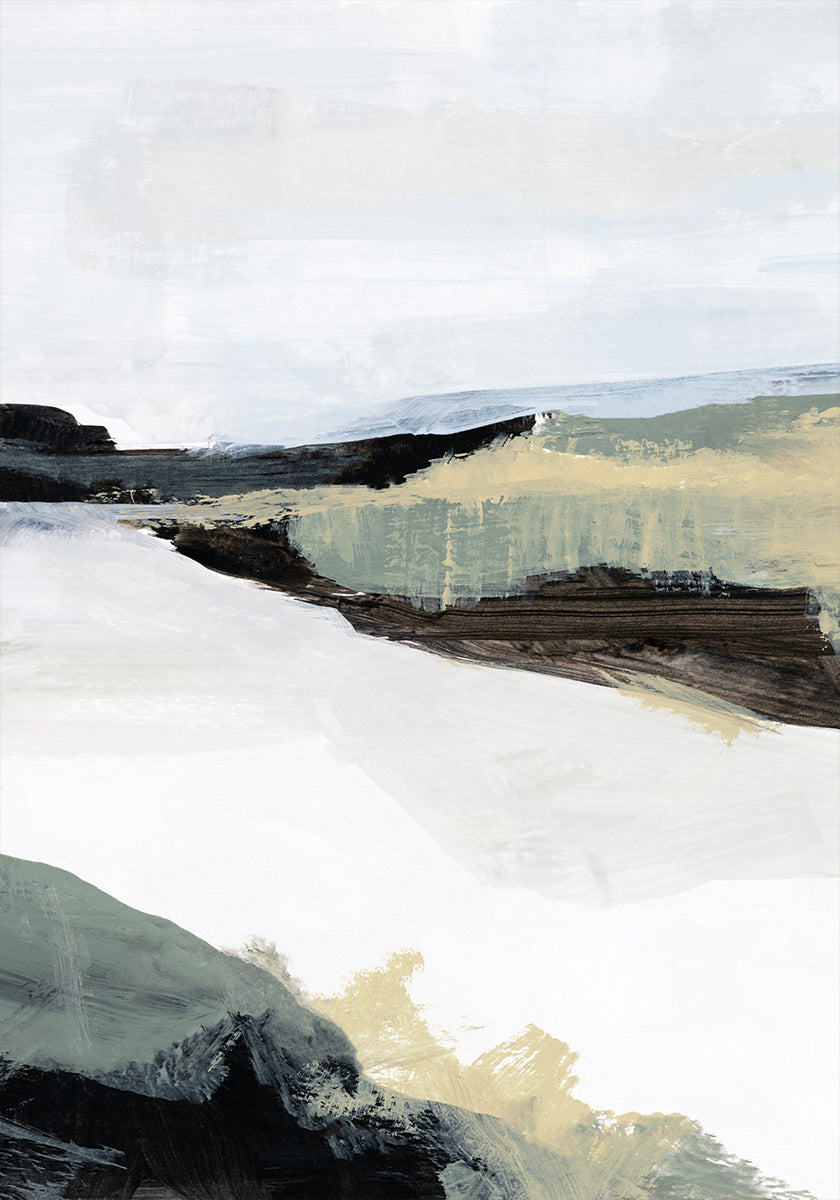 Drift into stillness with this painterly abstract horizon: veils of sage green, charcoal, and cloud-soft taupe fade into a misty shoreline. Gentle brushstrokes suggest distant mountains and a calm sea, balancing mood and minimalism—a serene, Scandi-leaning statement for quiet, modern spaces. Bring the horizon home.