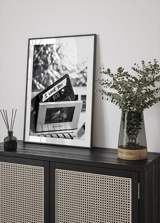 Artist Andreas Magnusson celebrates mixtape romance with a striking black-and-white close-up of a cassette labeled "I Love You." Clean lines, bold contrast, and subtle wear evoke analog nostalgia and retro charm. A minimalist statement for music lovers, this piece pairs sentiment with timeless, graphic cool.