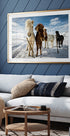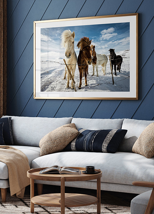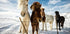 An Icelandic horse whips its thick mane in a bitter Arctic gust as snow drifts across a quiet valley. Beside the fence, a woman braces against the wind, cheeks pink with frost, hair mirroring the animal’s wild style. A crisp, wintry portrait of grit and grace, where cold air sparkles and freedom breathes.