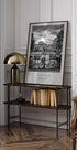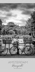 Melanie Viola captures Amsterdam’s Herengracht in refined monochrome: gabled canal houses align along the Gentlemen’s Canal, arching bridges edged with bicycles, and glassy water mirroring historic façades. A brooding sky lends timeless calm—an elegant city study for minimalist walls. Perfect for gallery walls.