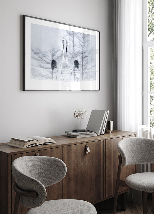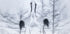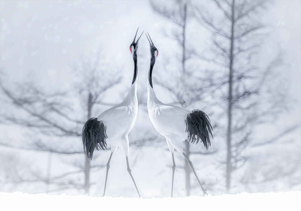 Two elegant cranes stand beak-to-beak in a snowy hush, their black-and-white plumage etched against a pale winter sky. Frost sparkles underfoot as their mirrored silhouettes suggest devotion and calm. In Love by Larry Deng APA captures a tender, romantic moment in nature—minimal, serene, and timeless.