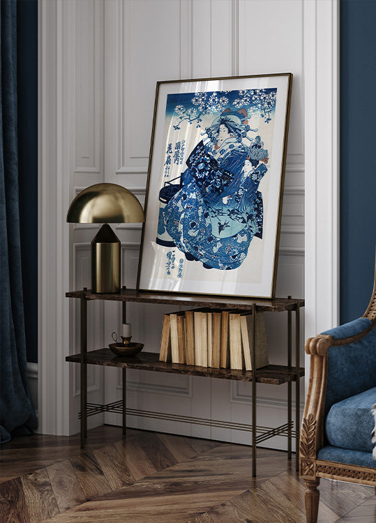 An elegant Edo-period beauty gazes serenely, her layered kimono patterned with delicate florals and deep indigo tones, hair adorned with ornate pins as soft folds and graceful lines flow across the scene. This timeless portrait by ukiyo-e master Utagawa Kuniyoshi brings quiet poise and classic Japanese refinement to any space.