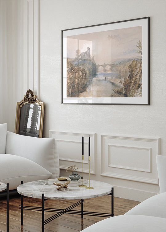 J.M.W. Turner's depiction of Barnard Castle captures the atmospheric ruins perched above the River Tees in County Durham, England. The artwork reflects Turner's signature style, characterized by his use of light and delicate watercolors to evoke mood and texture. The composition emphasizes the harmony between nature and historical architecture, creating a romantic and timeless portrayal of the landscape.