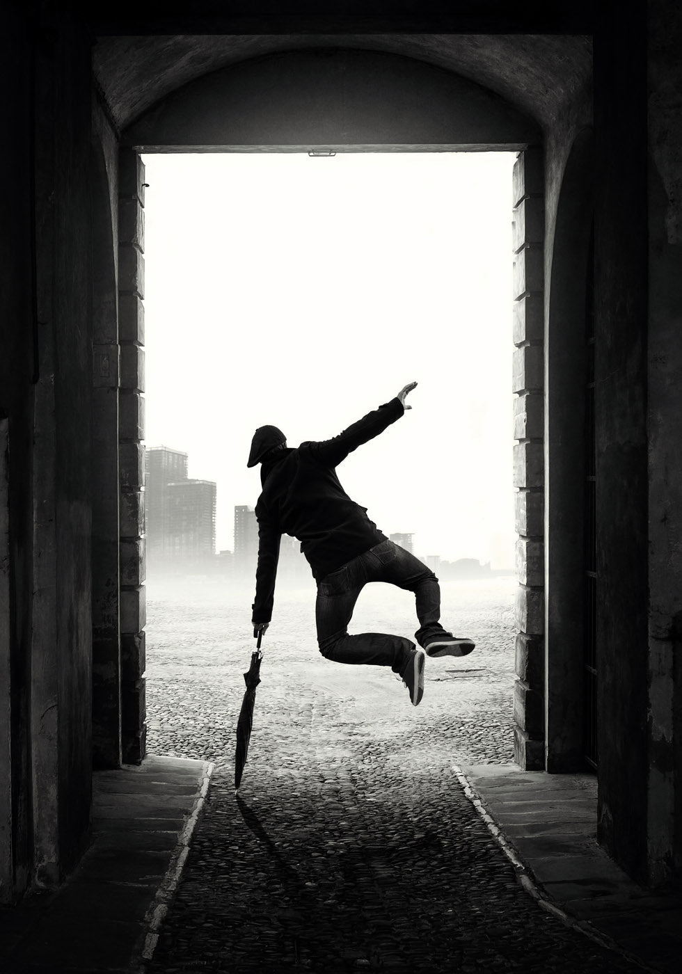 A captivating black and white photograph of a man mid-air, joyfully leaping through an arched passageway while holding an umbrella. The contrast between the shadowy foreground and the bright, open cityscape beyond adds a dramatic touch to the image. A perfect artwork to inspire freedom, spontaneity, and happiness in any modern space.