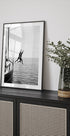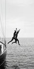 Capture the thrill of summer freedom in this monochrome scene by Andreas Magnusson: a figure arcs off a sailboat into shimmering sea, suspended between sky and water. The sleek hull, taut lines and rippling surface frame the decisive leap, blending grace, motion and salt‑spray energy in timeless black and white.