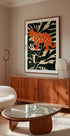 Step into a lush, retro jungle where a majestic tiger slips between layered leaves and palms. Graphic blocks and mosaic-like patterns weave oranges and deep greens into a bold, rhythmic scene. Vintage illustration vibes meet modern flair, turning untamed flora and feline grace into a striking focal point.