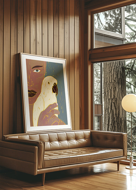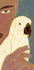 An intimate, modern portrait by artist Uma Gokhale: a serene woman and a vivid parrot meet cheek to beak, eyes bright with trust and quiet mystery. Tropical hues and bold shapes frame their tender exchange, suggesting whispered confidences, companionship, and the magnetic pull of untold stories. A soulful tribute to trust, care, and quiet love.