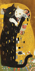 A purrfect parody of Gustav Klimt’s The Kiss: two sleek cats entwined beneath a shimmering mosaic cloak, set against a gilded Art Nouveau backdrop. Playful yet romantic, this feline tableau glows with swirling patterns, turning timeless passion into whiskered charm for cat lovers. A witty nod to museum masterpieces and vintage romance.