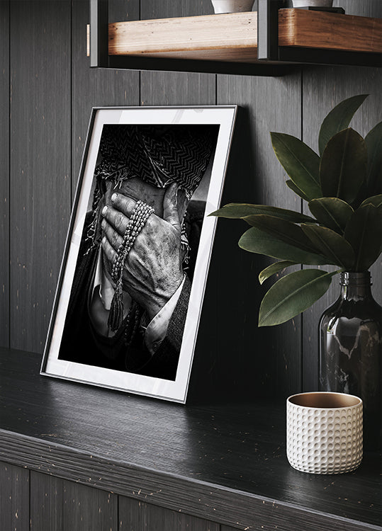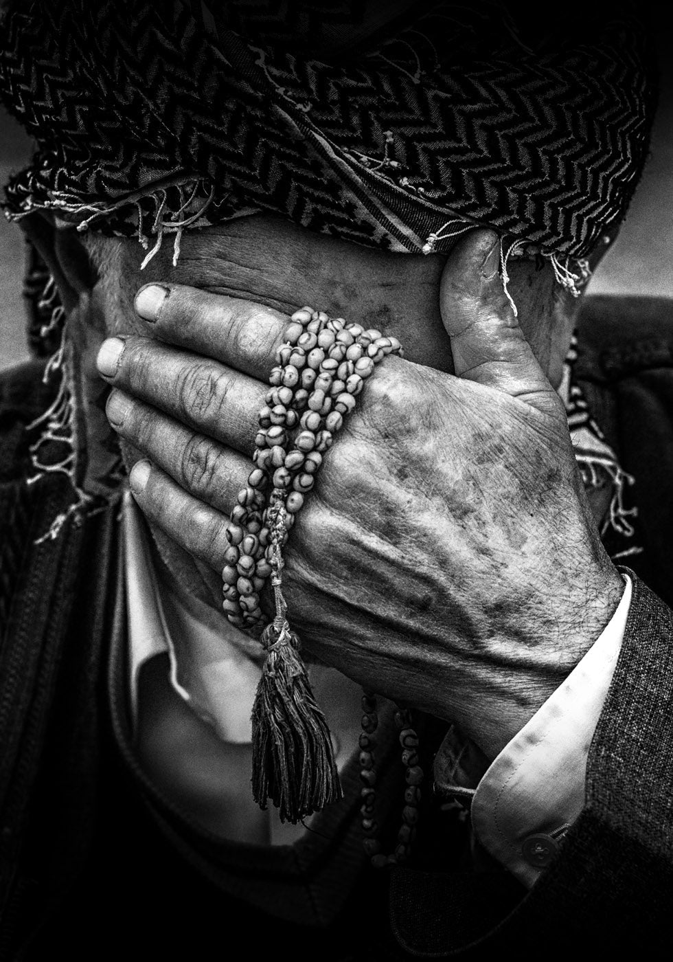 A powerful black-and-white portrait capturing the deep emotions of an elderly Kurdish man. His weathered hands, adorned with prayer beads, cover part of his face, conveying a sense of contemplation, resilience, and cultural depth. A striking piece of photography that brings raw emotion and heritage into any space.